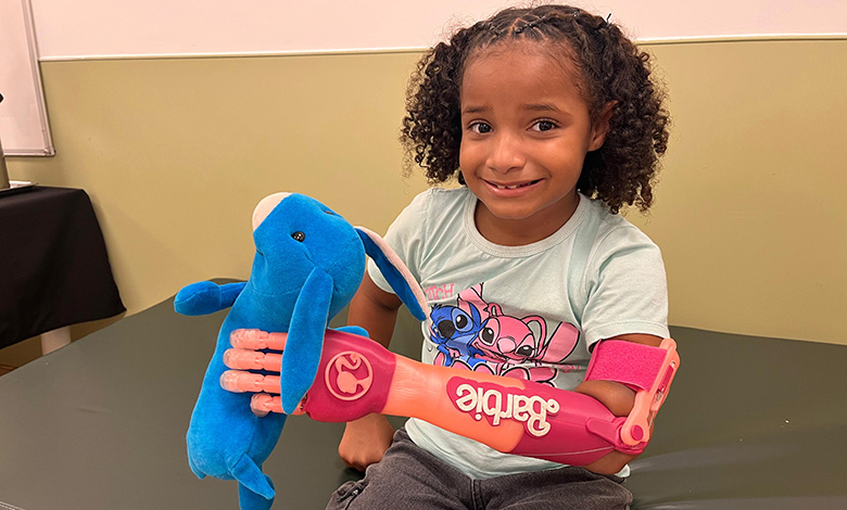 O sorriso no rosto da pequena Maria Heloá, de nove anos, não esconde a felicidade de receber a prótese em 3D do jeito que imaginava: toda em detalhes cor de rosa e com a estampa da sua boneca favorita. Diagnosticada ainda na barriga da mãe com malformação congênita, Maria Heloá nasceu sem o antebraço esquerdo. Hoje, ela está entre os primeiros pacientes beneficiados com as próteses produzidas no novo Centro Tecnológico de Impressão 3D e Reabilitação – CENTIR, do Instituto Nacional de Ortopedia e Traumatologia/Rio de Janeiro/RJ.